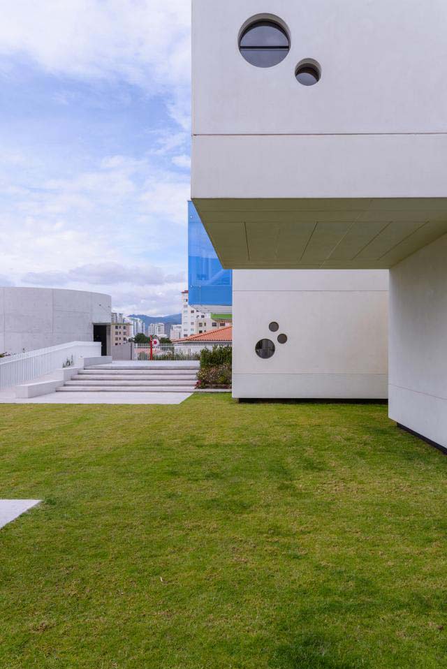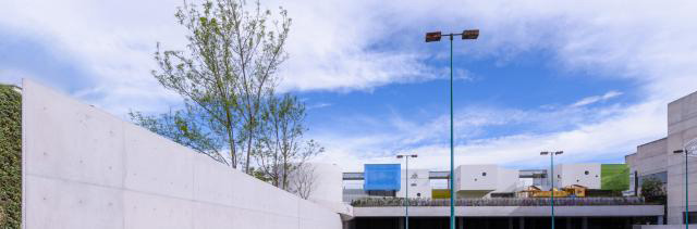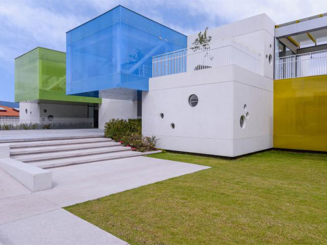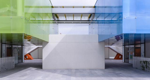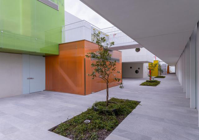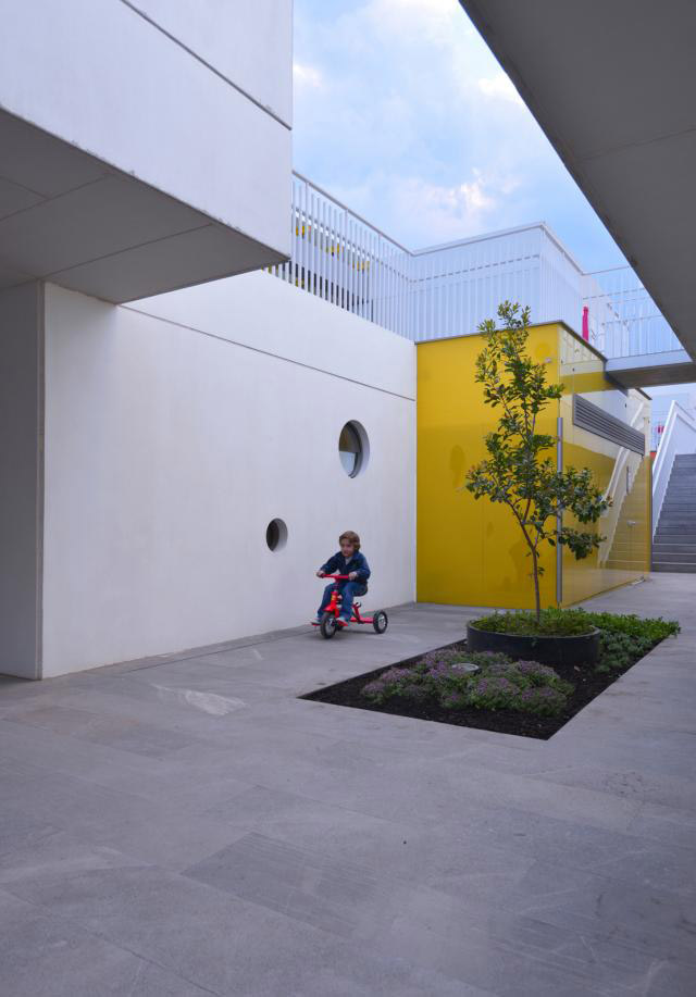 这是由LBR+A设计的KínderMonteSinaí幼儿园。新建的幼儿园建筑是在现有小学、初中和高中旁扩建的。该建筑分成三层,分别是停车场层、首层和二层。在停车场层,特意为幼儿园加建了一个礼堂和体育馆。首层里包括操场、庭院、图书馆和教室。教室是沿着主要轴线布置的,其含义就如堆砌积木。在首层的教室之间,设计了许多小庭院,小庭院旁是种满各种植物的院子和通向二层的楼梯。二层的教室都有一个阳台。每个教室内还有一个小型的厨房、储物室和浴室。教室内的家具也是根据儿童的尺度定做的。幼儿园一共有18间教室,其中12间是采用预制板,另外6间是采用彩色的安全玻璃。预制板是教室外墙的最佳选择。停车空间的长跨度是通过空腹桁架结构实现的。这种设计使得建筑更具灵活性。在这个项目中,达到可持续的目的是非常重要的。该幼儿园朝向南面,获得阳光之余也减少了建筑的能耗,无论是教室的内部还是外部都能维持舒适的温度。预制板上的窗户能达到自然通风的目的,收集到的雨水和污水都能够循环利用。